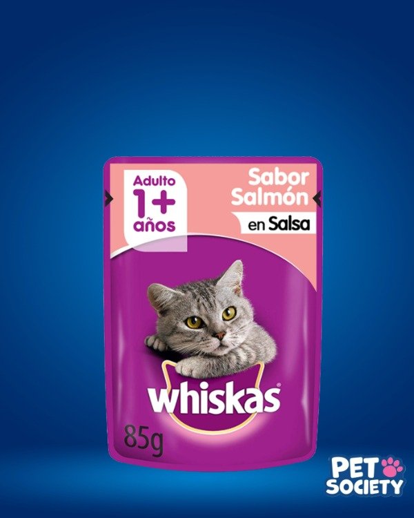 WHISKAS SOBRECITO ADULTO SABOR SALMÓN (SALSA). Whiskas en sobrecitos Adulto sabor salmón SALSA es un alimento húmedo nutricionalmente completo y balanceado. Son trocitos de carne cocidos al vapor en una deliciosa salsa. Su fórmula contiene proteínas de alta calidad proporcionando los nutrientes que ellos necesitan todos los días, manteniéndolos siempre saludables. Desarrollados con un 80% de agua en su composición aportan 1/3 de las necesidades hídricas de un gato al día. Esto ayuda a prevenir las enfermedades de tracto urinario que se originan por el stress y falta de ingesta diaria de agua (algo normal en los gatos debido a su origen desértico).