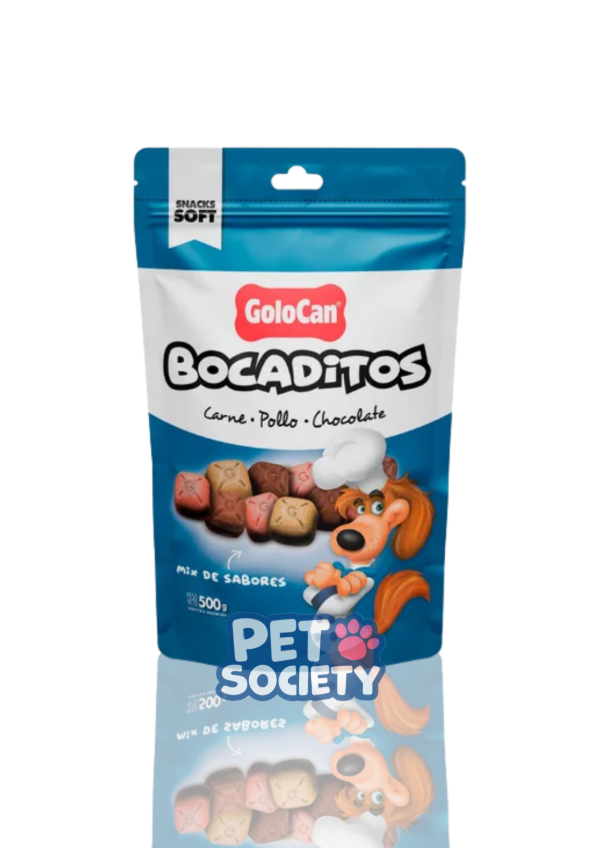 Los bocaditos GOLOCAN Carne-Pollo-Chocolate 500gr son una golosina suave y semihúmeda para perros, elaborada con carne, pollo y un toque de chocolate, ideal para premiar y mimar a las mascotas de forma saludable.