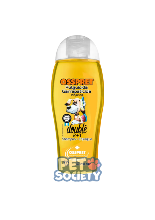 El Shampoo Double 2 en 1 Osspret combina shampoo y enjuague, proporcionando acción pulguicida, garrapaticida y piojicida. Formulado para perros mayores de 4 meses, humecta y da brillo al pelaje, además de ser efectivo contra parasitosis externas. No apto para gatos.